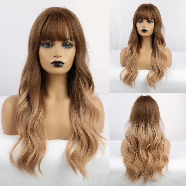 JONRENAU Synthetic Ombre Brown Mixed Blonde Wigs with Bangs Long Natural Wave Hair Party Wigs for White/Black Women